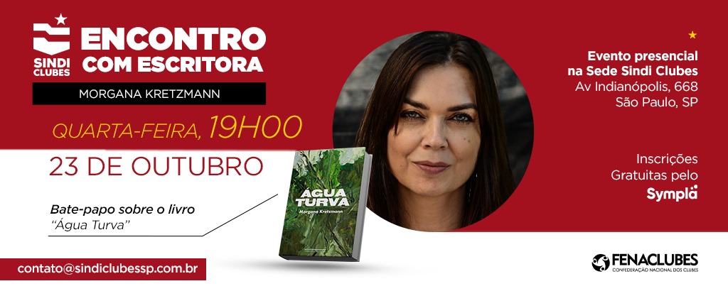 O Sindi Clubes SP – Sindicato dos Clubes do Estado de São Paulo – realiza o último Encontro com Escritor do ano com a escritora e roteirista brasileira, Morgana Kretzmann. O encontro será dia 23 de outubro, às 19h, na sede do Sindi Clubes, e abordará sobre seu livro “Água turva”, com entrada gratuita mediante retirada de ingresso no site Sympla.