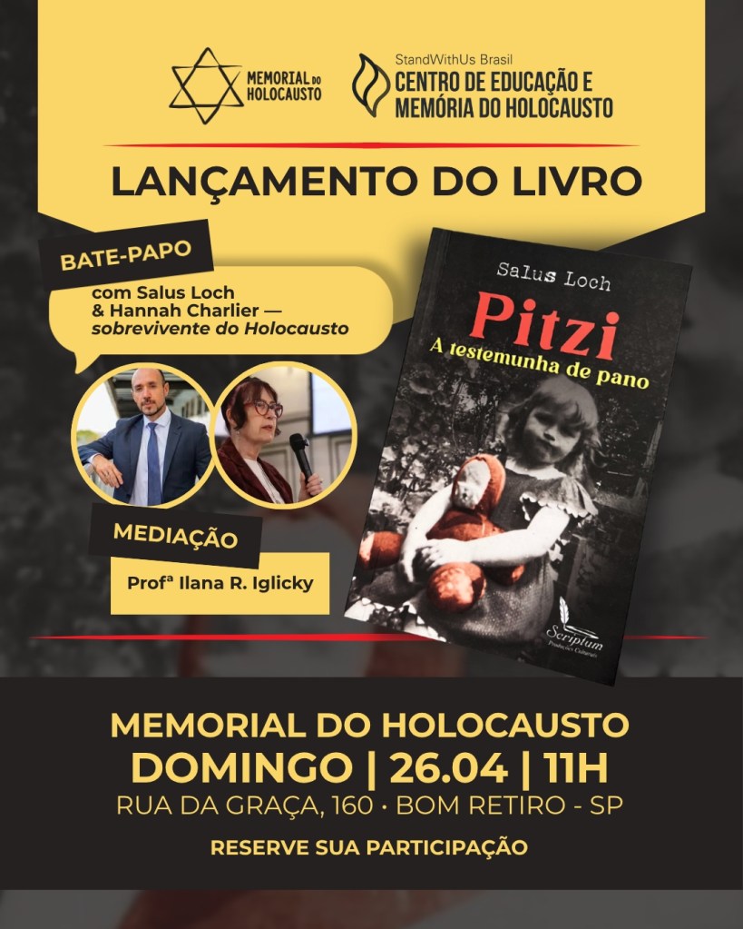 O Memorial do Holocausto promove, no próximo dia 26 de abril, o lançamento do livro Pitzi: a testemunha de pano, do jornalista, escritor e advogado Salus Loch. O evento acontece às 11h, na sede do Memorial, no bairro do Bom Retiro, em São Paulo, e contará com um bate-papo especial com o autor e a participação de Hannah Charlier.